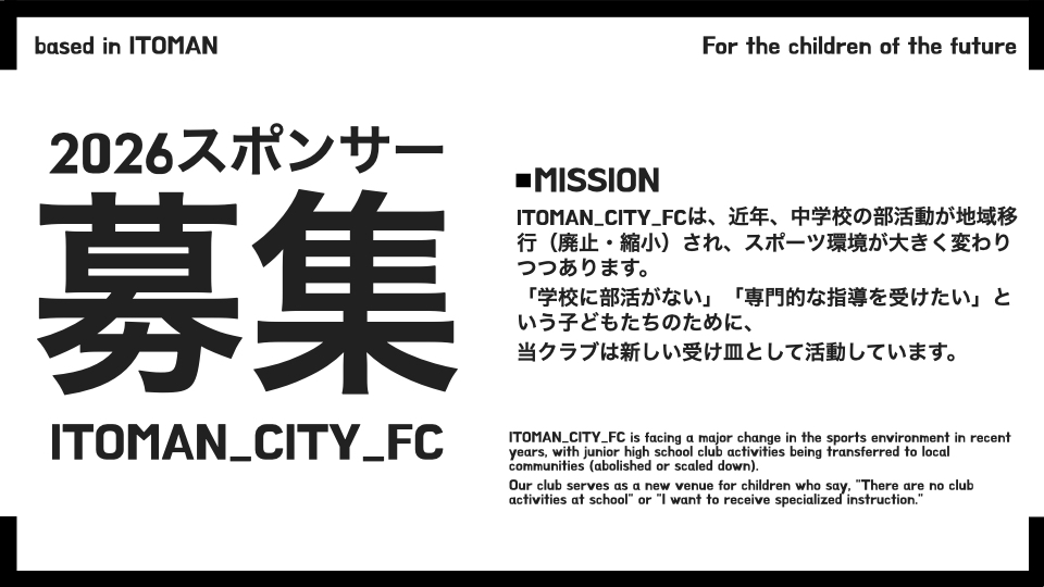 ITOMAN_CITY_FCの活動をご支援いただけるスポンサーを募集しております。糸満市及び周辺の企業様、個人様に向けた特典や企画などご案内させていただきます。ご興味のある方はこちらから